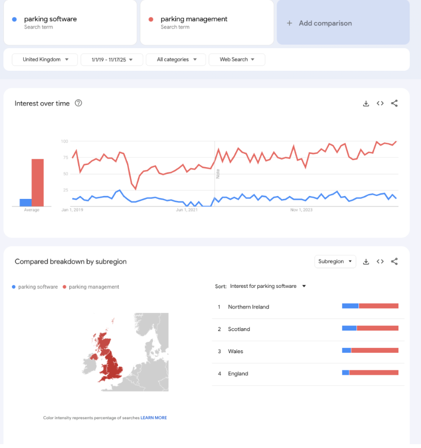Old-school parking is falling behind. Google Trends data from 2019–2025 shows that searches for ‘parking operator’ and ‘monthly parking’ are flat or declining, while interest in ‘parking software’ and ‘parking management software’ keeps climbing.